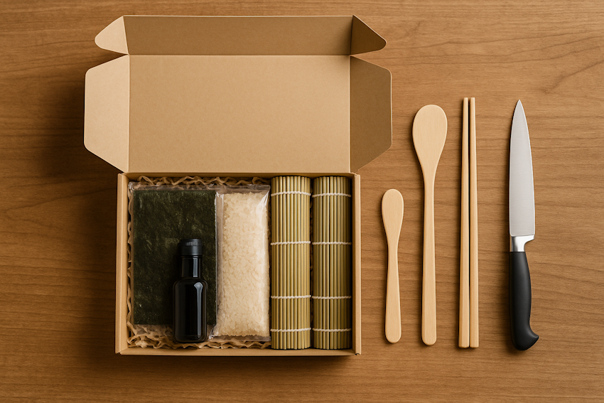 - Набор для приготовления суши. Один из самых популярных наборов, поскольку азиатская кухня очень полюбилась и в России, и во всем мире. В базовую комплектацию обычно входят циновка для сворачивания роллов, палочки для подачи, мерный ковшик или ложка для риса, иногда — формочки для роллов, пакетики нори и рис клейких сортов. Расширенные наборы также могут включать соевый соус, имбирь, васаби или даже готовую заправку для риса. Для подарка лучше выбирать комплекты из качественных материалов и в красивом оформлении. Ориентируйтесь на средний и премиальный ценовой сегмент, поскольку дешевые наборы могут подвести и оставить не самое приятное впечатление.