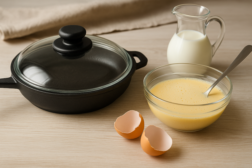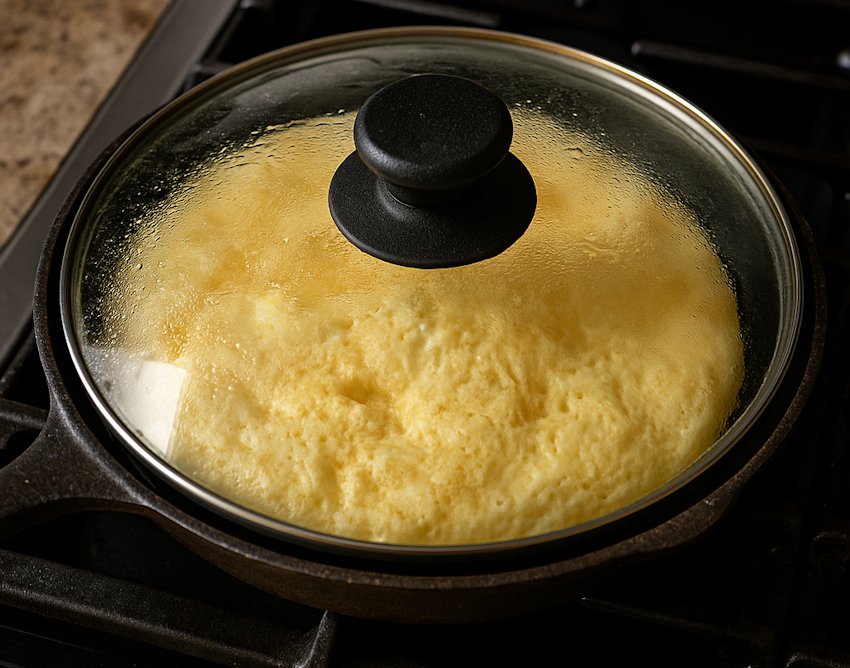 Сковорода обязательно должна быть с крышкой. Без нее верхняя часть омлета останется сырой, и пышность не зафиксируется. При жарке под крышкой образуется мягкий пар, который прогревает омлет сверху и позволяет ему подняться равномерно.