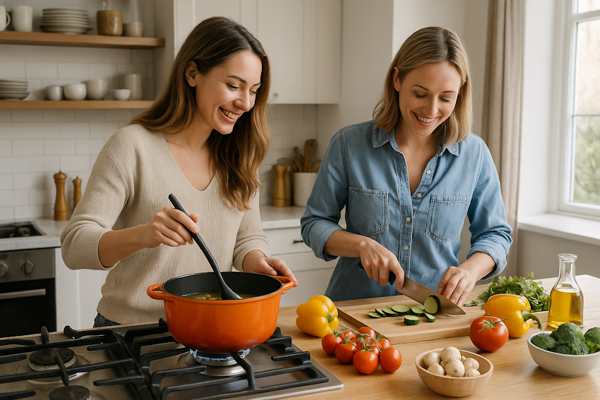 Совместная готовка снимает часть нагрузки и превращает процесс в коммуникацию. Позовите друга или родственника: один режет, второй жарит. Это помогает экономить время и силы. Если вы привыкли сами готовить блюдо от и до, поделите не процессы, а блюда. Можно также распределить роли: один отвечает за еду, другой за сервировку. При таком подходе приготовление еды становится событием, а не обязанностью. Это особенно помогает, если вы чувствуете одиночество или усталость — взаимодействие добавляет эмоций. При этом не стремитесь к идеалу: готовка вдвоем — это в первую очередь возможность пообщаться и провести время с близкими.