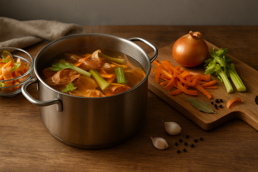 Обрезки моркови, луковая шелуха, остатки сельдерея — то, что обычно летит в мусор, на самом деле может послужить основой для овощного бульона. В них содержится максимум вкуса: шелуха лука придает цвет и сладость, морковь — плотность, а сельдерей — характерный аромат.
