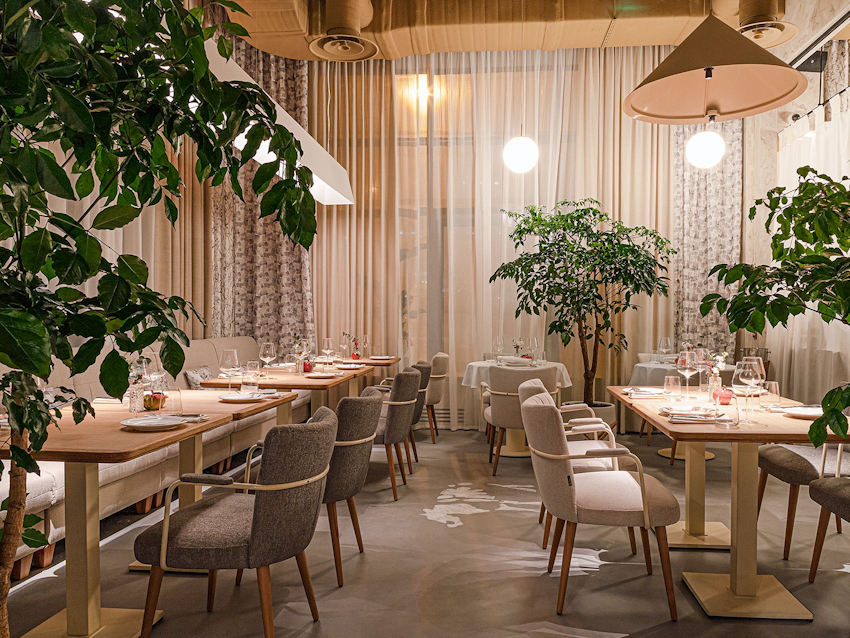 В основе концепции — минимализм и эко-тренды, поэтому в дизайне интерьера делался акцент на натуральных материалах. При этом оформление не перегружено декоративными элементами, а все предметы интерьера — от мебели до салфетниц — выполнены в одном стиле по проекту дизайнера Глеба Полянского.