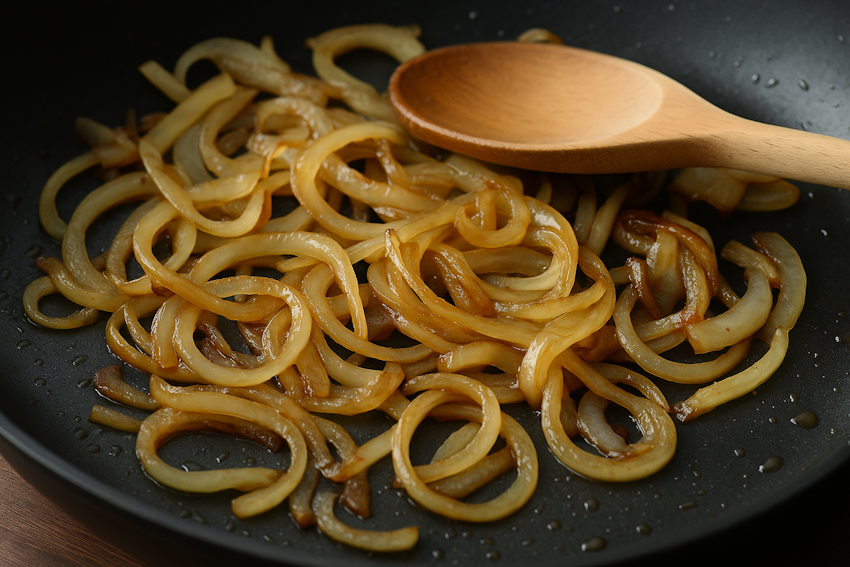 Карамелизованный лук получается в результате длительного томления на медленном огне. Природные сахара постепенно разлагаются и концентрируются, превращаясь в сладкую, насыщенную, почти тягучую массу. Это требует времени, но результат стоит усилий: лук меняется до неузнаваемости.