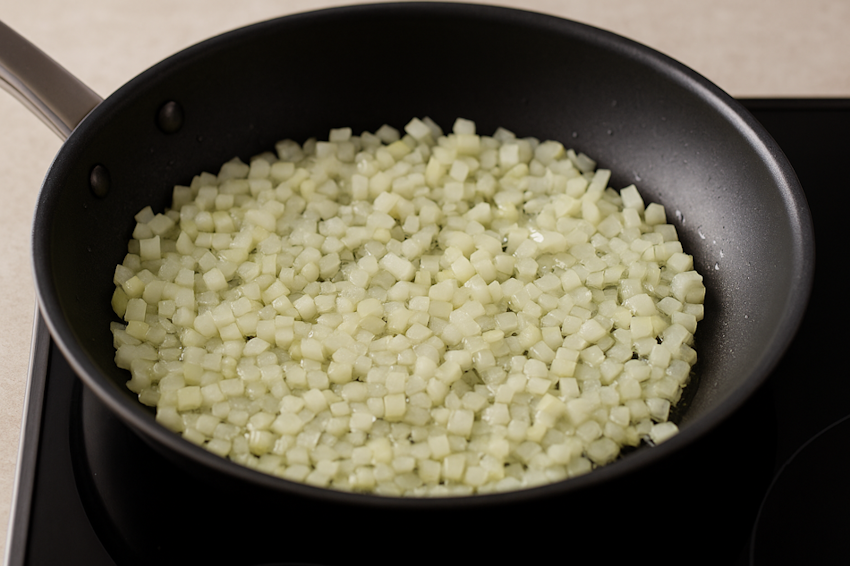 Пассеровка — один из базовых кулинарных приемов: нарезанный лук готовится на среднем или слабом огне до прозрачности и легкой мягкости, но без поджаривания и карамелизации. Такой лук становится нежным, теряет резкость, но при этом остается плотным. Он перестает доминировать в блюде и начинает работать как ароматическая база.