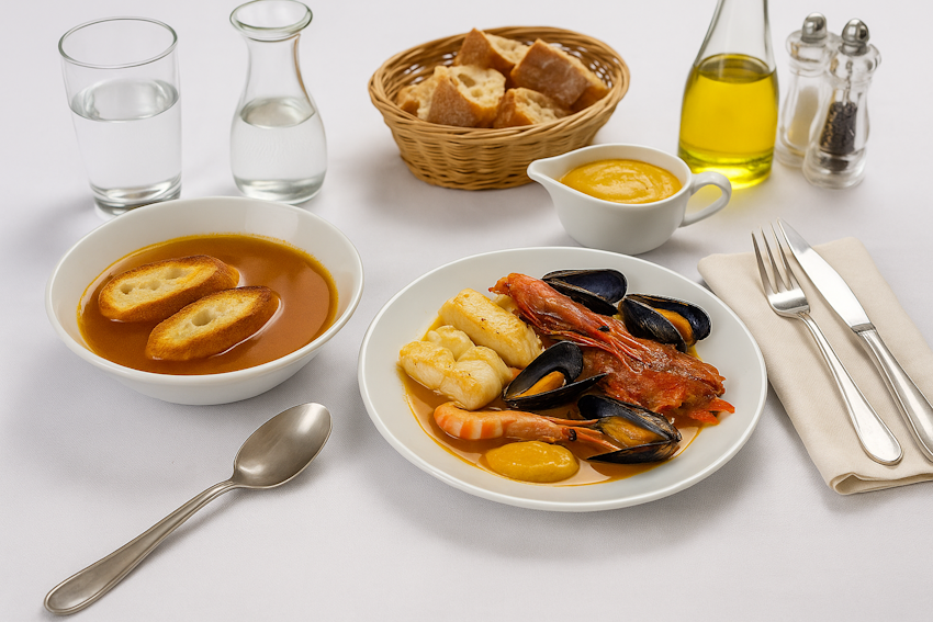 Чаще всего рыбу и морепродукты подают со свежими овощам, оливками, иногда — с картофелем. Из специй в ходу чеснок, петрушка, тимьян, розмарин, шафран. Отдельного внимания заслуживает буйабес — рыбный суп, в который добавляют несколько видов рыбы, морепродукты, айоли и подают с хрустящим хлебом. Изначально этот суп был блюдом рыбаков, которые готовили его из непроданной рыбы. В наши дни это праздничное, часто дорогое блюдо, которое подают в хороших ресторанах. В классический вариант входят не менее трех видов рыбы. Ее варят в рыбном бульоне с луком, чесноком, фенхелем, томатами, оливковым маслом, белым вином и шафраном. Отдельно подают гренки, натертые айоли или соусом руй (rouille) — чесночной пастой с острым перцем и оливковым маслом.
