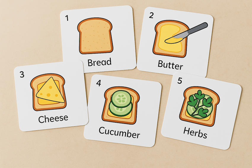 Такое задание отлично тренирует внимание, логическое мышление, умение следовать инструкции. Подобные игры особенно полезны для гиперактивных детей: они учат сосредоточиться и работать по этапам. Детям помладше лучше объяснить весь процесс заранее. Обговорите с ребенком план действий и разложите ингредиенты в том порядке, в каком они будут использоваться. После выполнения задания обсудите с ребенком, что получилось, и предложите самостоятельно придумать новую версию блюда. Кстати, эту игру можно совместить с изучением иностранного языка: для этого напишите на карточках названия продуктов, например, по-английски.